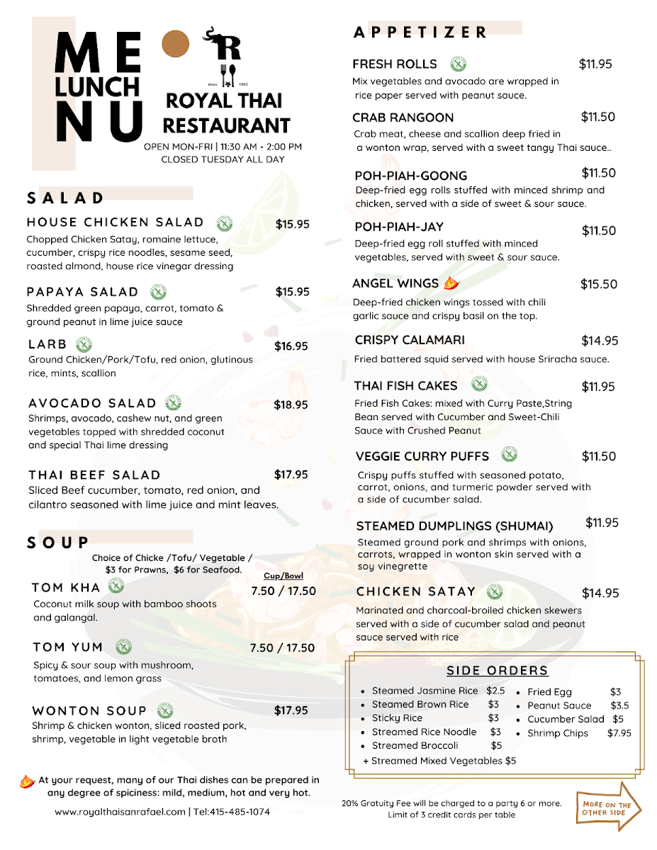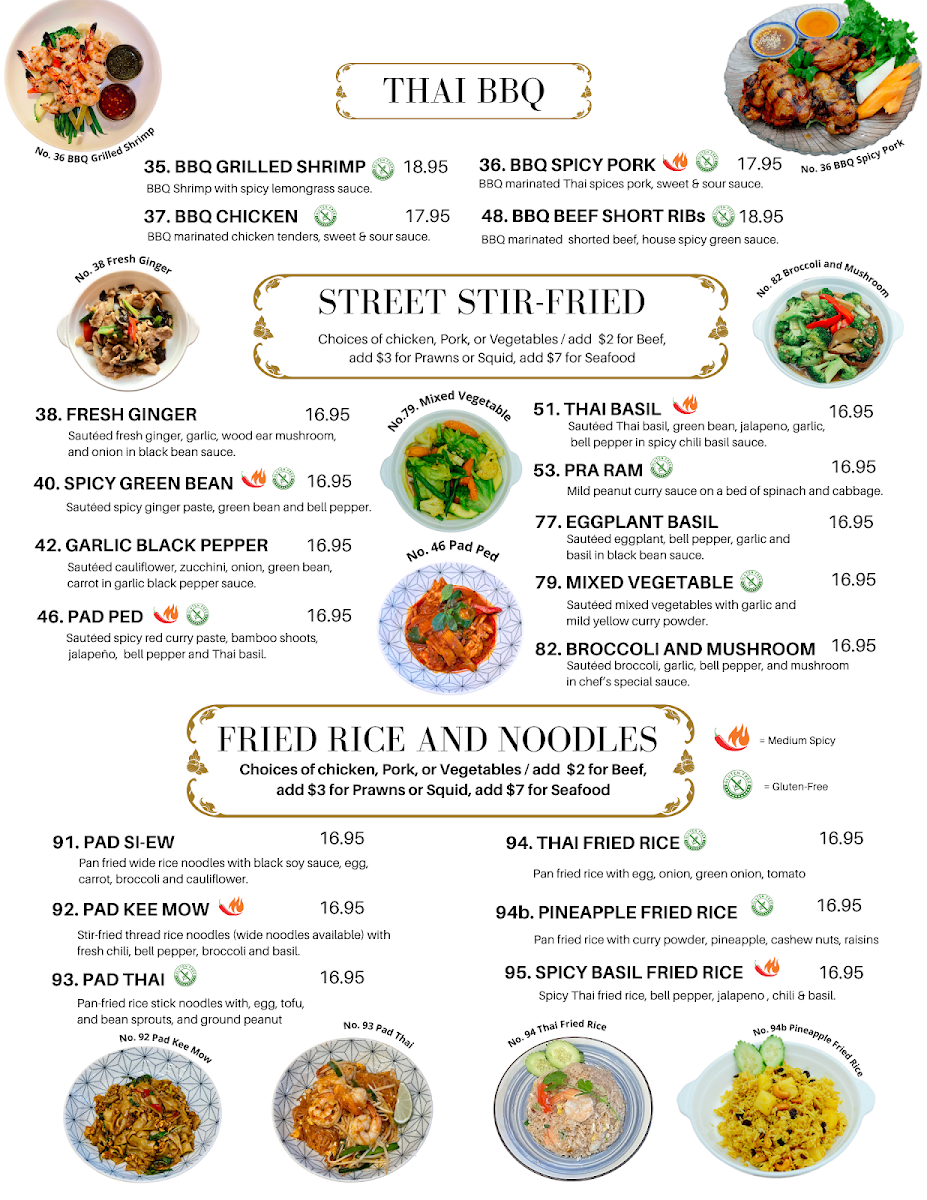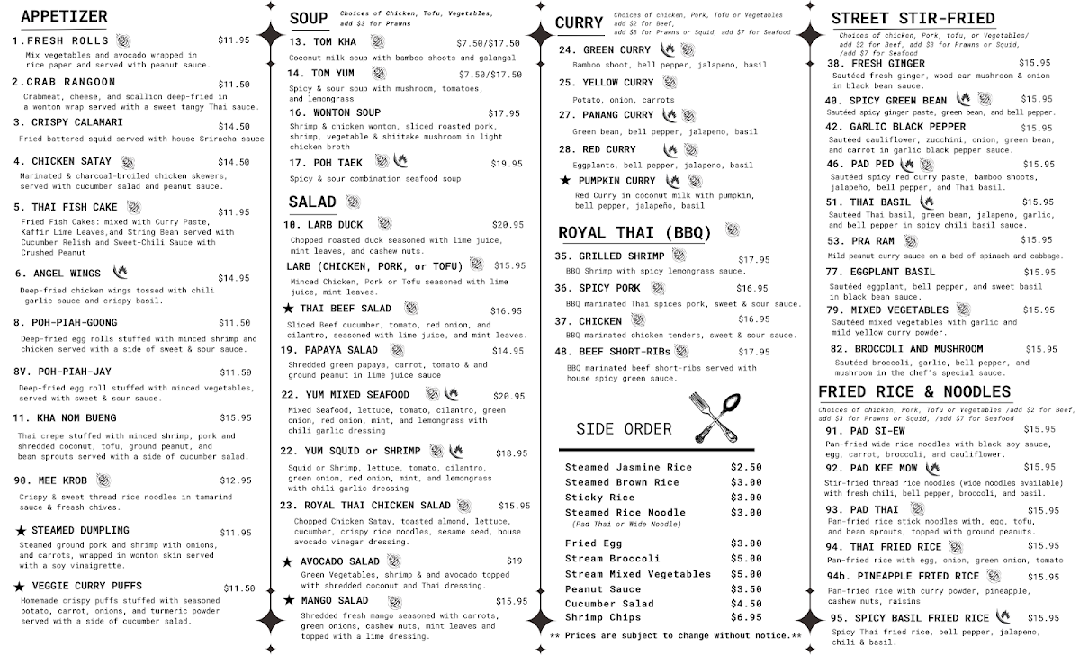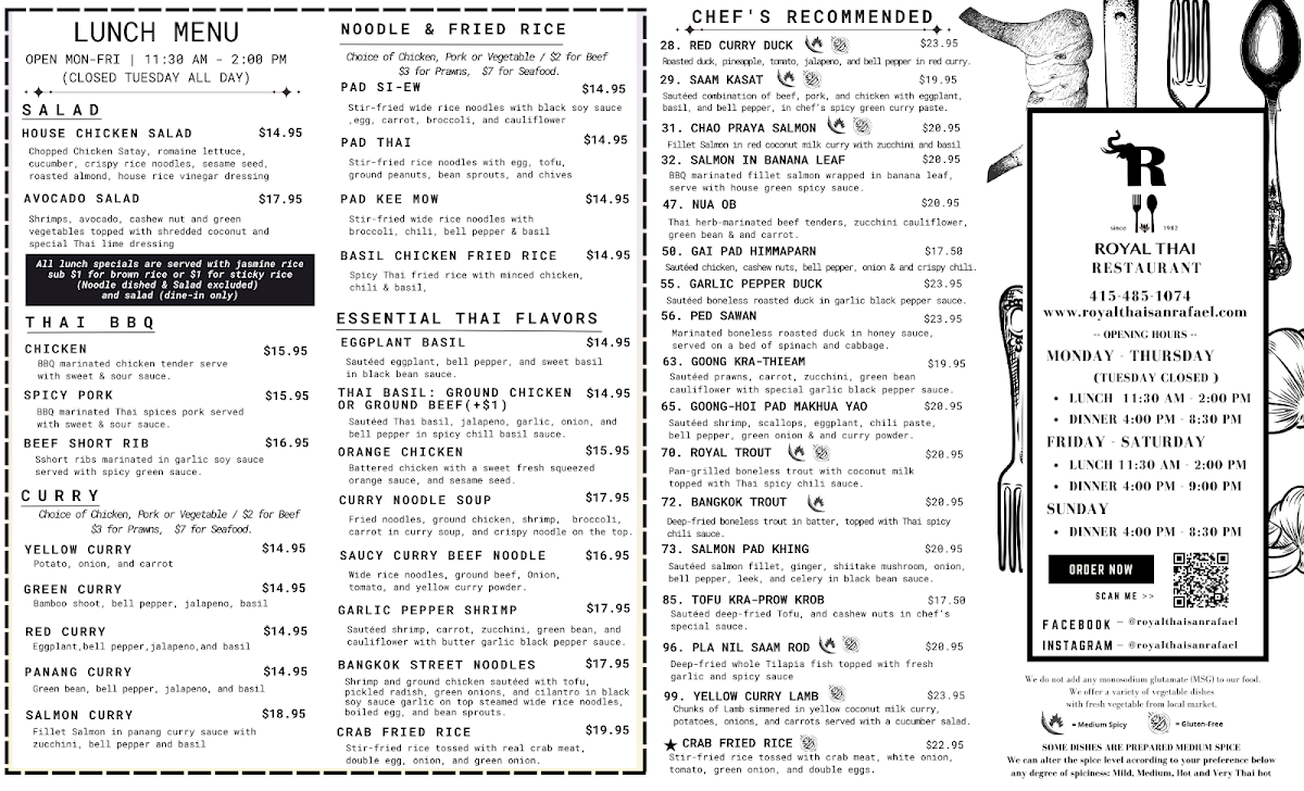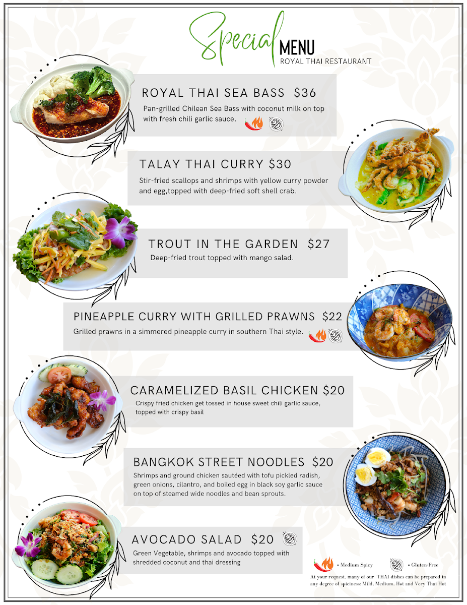 From a reviewer’s perspective, the menu at Royal Thai Restaurant offers a wide and flavorful selection, with standout dishes across many categories. The lunch specials like L. BRANZINO SAAM ROD, L. Salmon Curry, L. Pad Thai Tom Yum Goong, L. Bangkok Street Noodles, and L. Boat Noodles provide great variety for midday dining, while recommended items such as Sai Ua - Northern Thai Sausage, Nam Khao Tod, Mok Pla (Steamed Fish in Banana Leaf), Moo Hong (Southern Thai Braised Pork Belly), and AUNTIE’S THAI TWIST MONGLIAN BEEF highlight the restaurant’s signature flavors. The curry section features classics like 24. Green Curry, 25. Yellow Curry, 27. Panang Curry, 28. Red Curry, and Pumpkin Curry, while noodle favorites include 91. Pad Si-Ew, 92. Pad Kee Mow, 93. Pad Thai, Pad Thai Tom Yum Goong, and 94. Thai Fried Rice. House specials such as 96. Branzino Saam Rod, 70. Chili Branzino, Branzino In The Garden, and 31. Salmon Curry further showcase the kitchen’s specialties. Overall, the menu is extensive and well-rounded, offering everything from appetizers and soups to BBQ, stir-fried dishes, desserts, and drinks, making it easy for diners to find something satisfying at a reasonable price point.