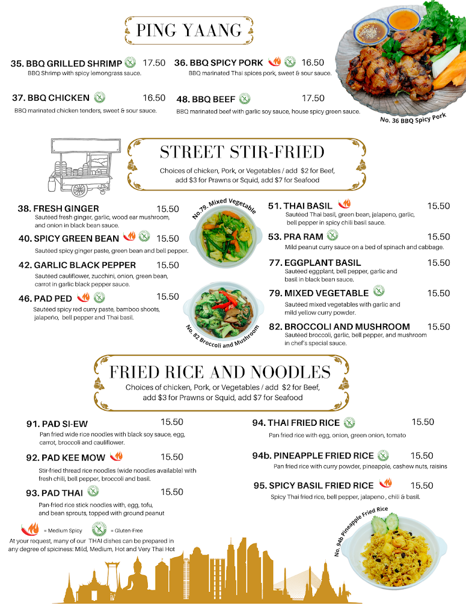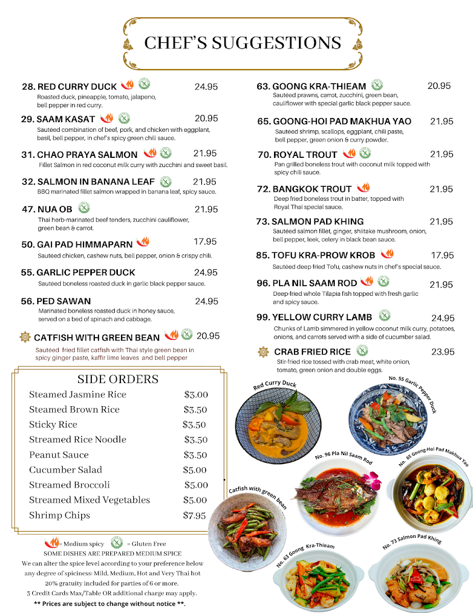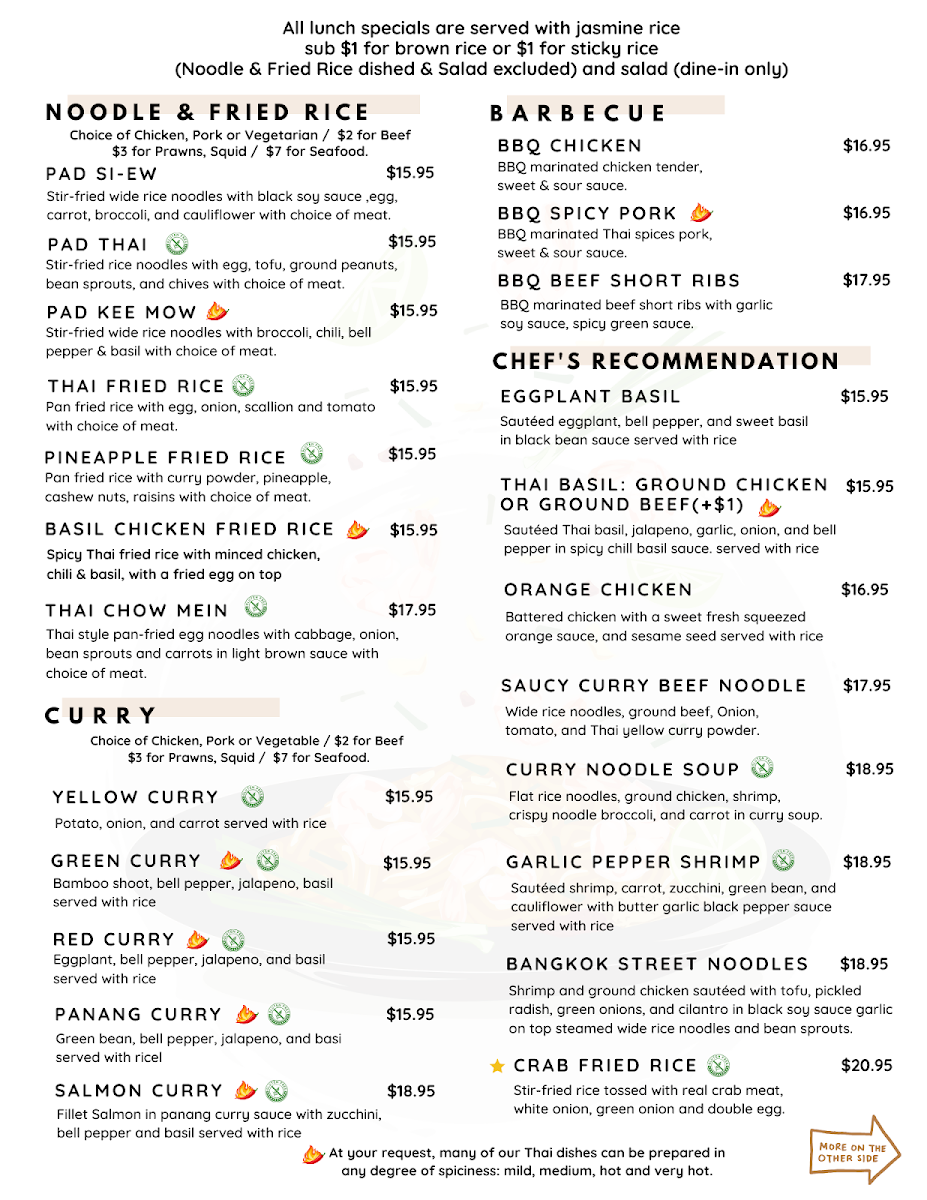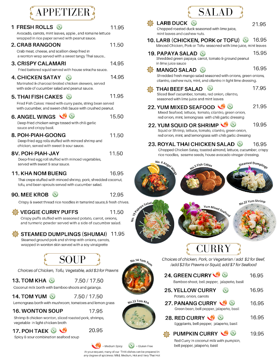 From a reviewer’s perspective, the menu at Royal Thai Restaurant offers a wide and flavorful selection, with standout dishes across many categories. The lunch specials like L. BRANZINO SAAM ROD, L. Salmon Curry, L. Pad Thai Tom Yum Goong, L. Bangkok Street Noodles, and L. Boat Noodles provide great variety for midday dining, while recommended items such as Sai Ua - Northern Thai Sausage, Nam Khao Tod, Mok Pla (Steamed Fish in Banana Leaf), Moo Hong (Southern Thai Braised Pork Belly), and AUNTIE’S THAI TWIST MONGLIAN BEEF highlight the restaurant’s signature flavors. The curry section features classics like 24. Green Curry, 25. Yellow Curry, 27. Panang Curry, 28. Red Curry, and Pumpkin Curry, while noodle favorites include 91. Pad Si-Ew, 92. Pad Kee Mow, 93. Pad Thai, Pad Thai Tom Yum Goong, and 94. Thai Fried Rice. House specials such as 96. Branzino Saam Rod, 70. Chili Branzino, Branzino In The Garden, and 31. Salmon Curry further showcase the kitchen’s specialties. Overall, the menu is extensive and well-rounded, offering everything from appetizers and soups to BBQ, stir-fried dishes, desserts, and drinks, making it easy for diners to find something satisfying at a reasonable price point.